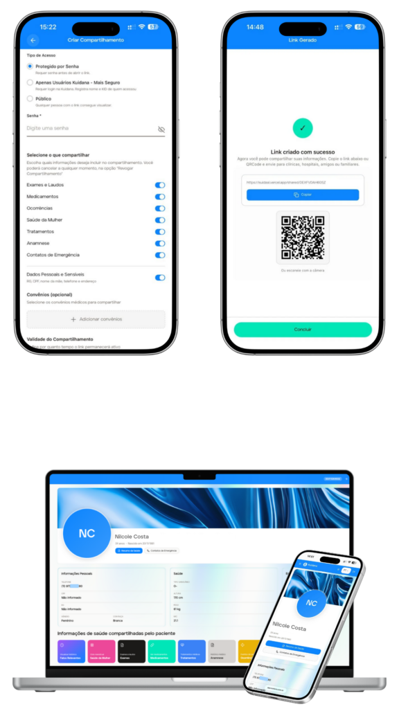 Gere um Kuidalink e compartilhe de forma segura seu histórico de saúde com médicos, cuidadores e familiares. Monitore quem acessou seu link e cancele quando quiser.